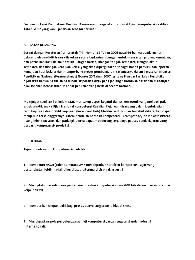 Udanawu telp0342 552030 kode pos 66154 blitar e-mail. Contoh Proposal Uji Kompetensi Pemasaran. Unduh Modul TIK SD Kelas 123456 disini Contoh Proposal UKKUji Kompetensi SMK Program Keahlian Pemasaran--Hallo kang Abiey bagi contoh proposal untuk Uji Kompetensi Keahlian SMK program keahlian Pemasaran dong.