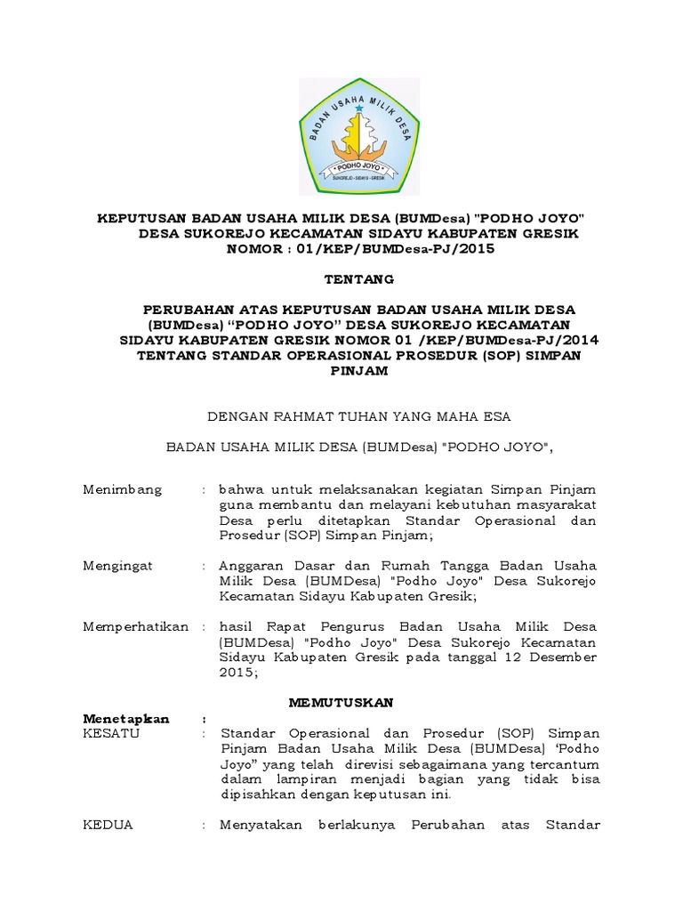 SUKOREJO Pada Tanggal. Untuk unit unit usaha lainnya pada bumdes silahkan dimodifikasi saja dengan sistematika penyusunan sop yang sama seperti pada contoh ini. Berikut ini adalah contoh Standar Operasional Prosedur SOP unit usaha Simpan Pinjam pada BUM Desa Sukorejo Kabupaten Gresik.