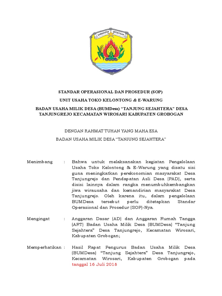 Tidak dapat dipungkiri lagi bahwa sop bumdes sangat penting bagi pengurus bumdes. 2139 Contoh SOP BUMDes Format PDF-Doc Diposkan Oleh. PJ2014 Tentang Standar Operasional dan Prosedur SOP Badan Usaha Milik Desa BUMDesa Podho Joyo dicabut dan dinyatakan tidak berlaku.