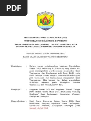Contoh SOP BUMDESpdf merah said. Untuk unit-unit usaha lainnya pada Bumdes silahkan dimodifikasi saja dengan sistematika penyusunan SOP yang sama seperti pada contoh ini. Berikut ini salah satu contoh STANDAR OPERASIONAL DAN PROSEDUR SOP Unit Simpan Pinjam Badan Usaha Milik Desa BUMDes.