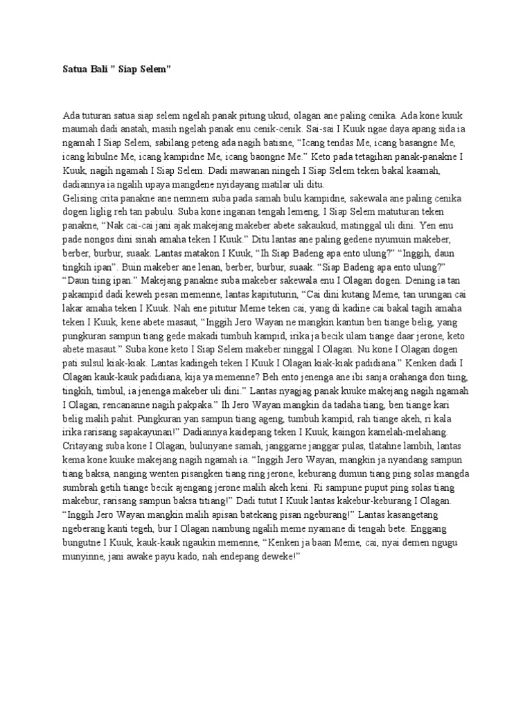 No More Posts Available. Satua Bali - I Siap Selem Satua Bali - I Sugih Teken I Tiwas Satua Bali - I Ubuh Satua Bali - Sang Lanjana Satua Bali - I Ketimun Mas. Kenehné apang gegaéné enggal pragat tur lantas nampi upahné.